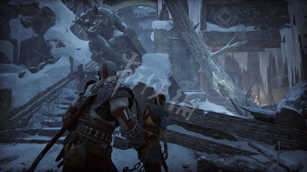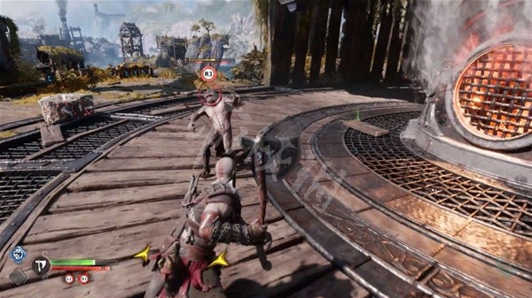 来达到一个倾倒的柱子旁,拉近之后将较弱的敌人击飞。向后推动左摇杆并按下R1可以进行一次快速的回旋投掷。